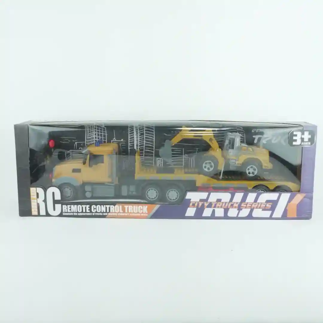 Diseño y Colorido de Obra: El conjunto luce los colores clásicos de la maquinaria de construcción y transporte, predominantemente un amarillo vibrante para la retroexcavadora, que contrasta a la perfección con el color de la mula, dándole un aspecto totalmente realista y visible. El remolque de la mula es de color gris o negro, simulando metal.