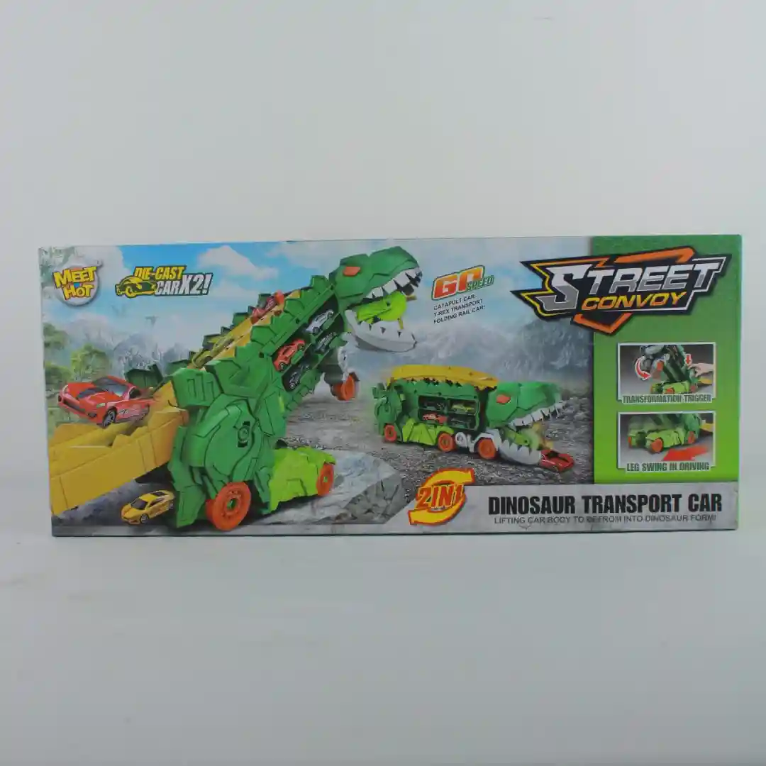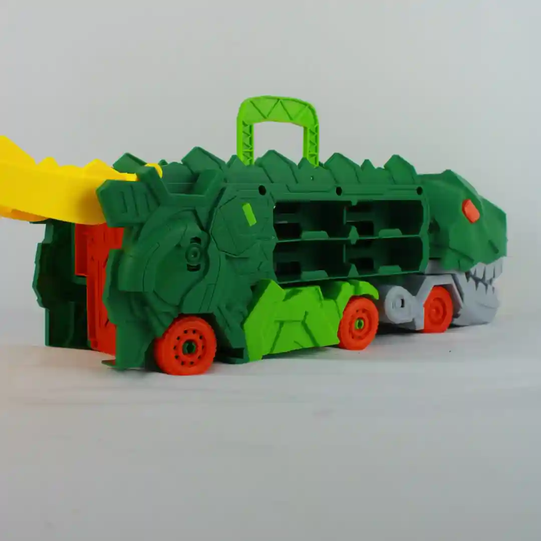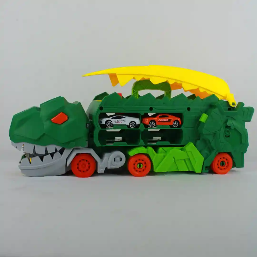 Temática atractiva: La combinación de vehículos de carga y figuras de dinosaurios es un imán para los niños.