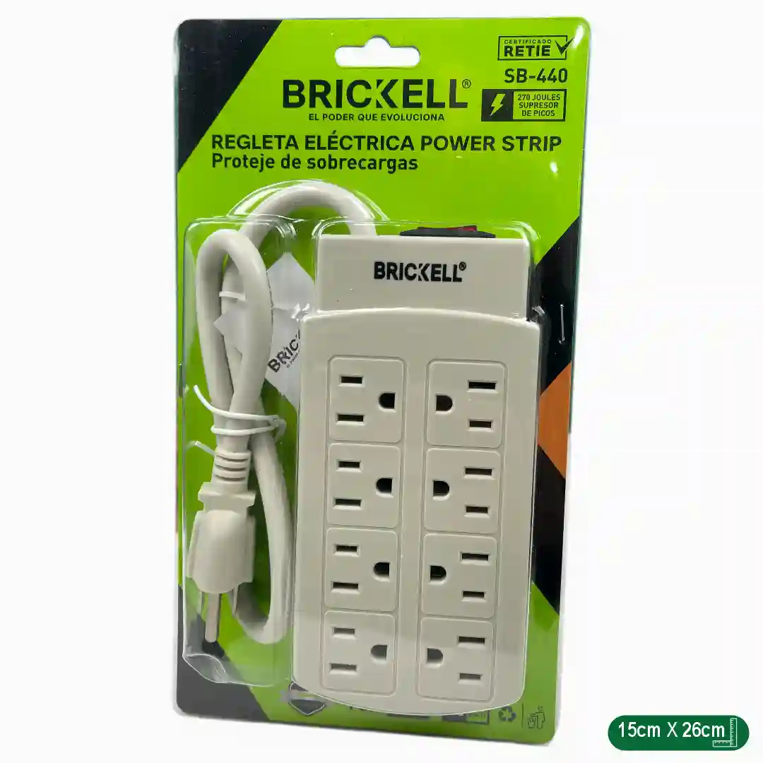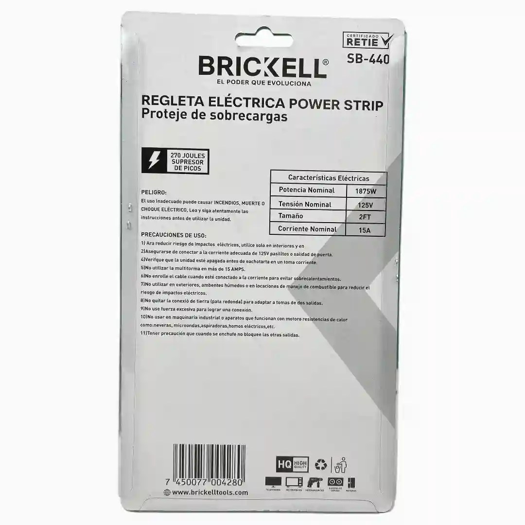 Especificaciones Marca: BRICKELL Potencia Nominal: 1875W Tensión Nominal: 125V Corriente Nominal: 15A Tamaño del cable: 2 Pies (61 centímetros aproximadamente) Certificado RETIE