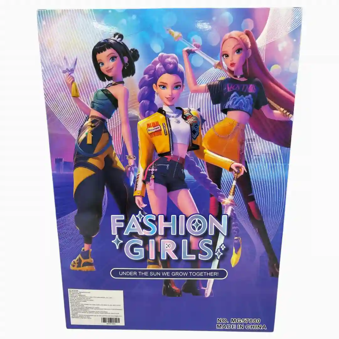 Set de juego premium de la línea Fashion Girls que combina moda, música y acción en una sola presentación. Esta muñeca articulada está diseñada para ofrecer una experiencia interactiva completa, destacando por su estilo urbano contemporáneo y su set de instrumentos musicales. Bajo el lema «Bajo el sol crecemos juntas», este juguete fomenta la creatividad y la expresión artística a través del juego de roles.