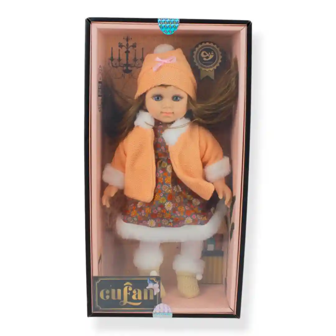 La muñeca viene vestida con una bufanda y un abrigo de invierno.