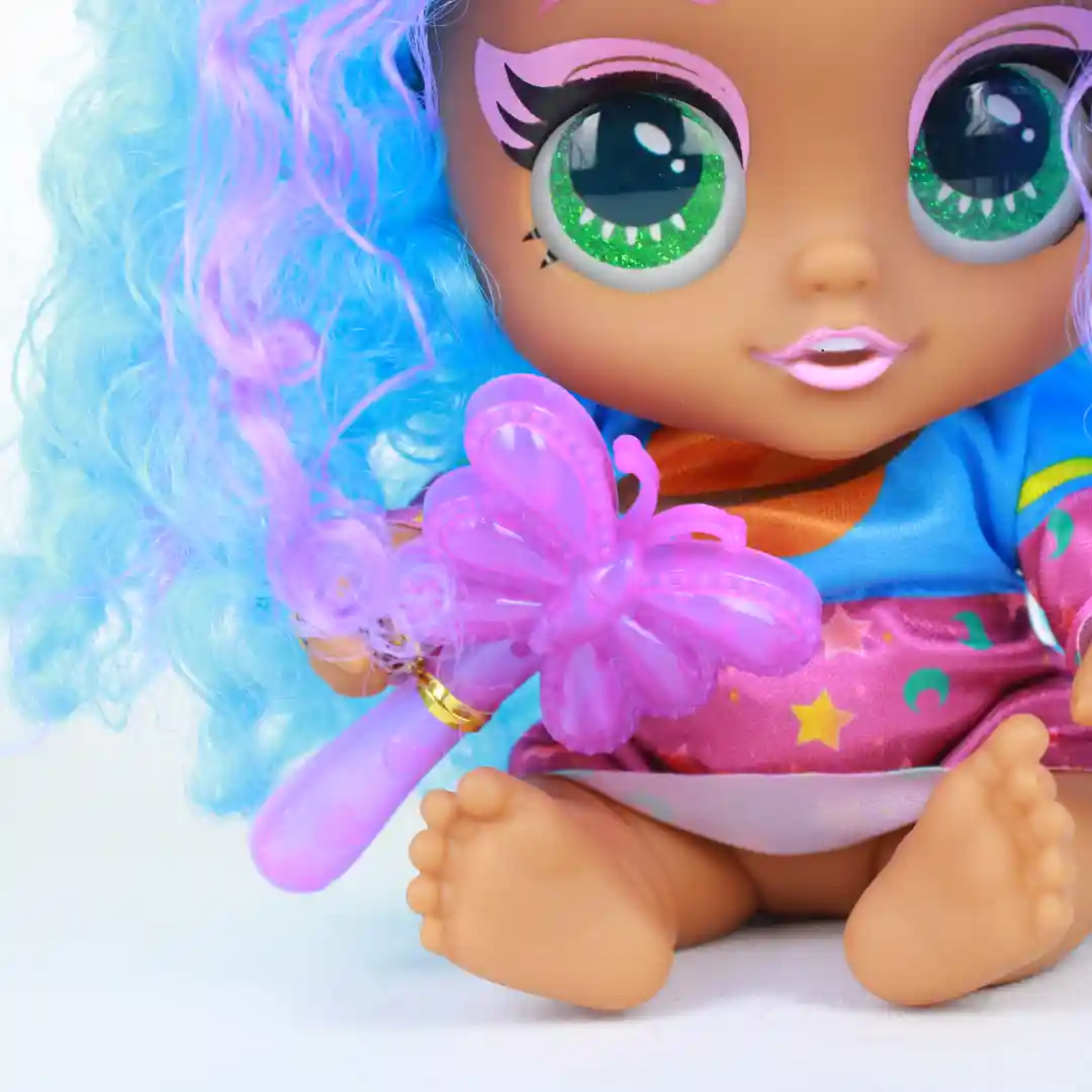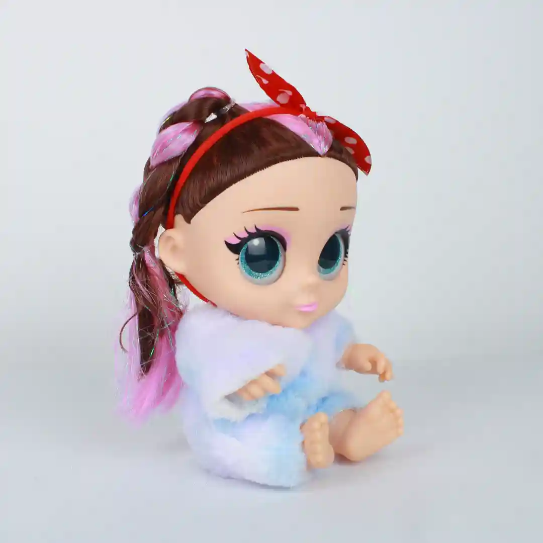 - Diseño: cabello trenzado con detalles de colores, ojos grandes y expresivos, ropa de felpa con detalles en colores pastel.