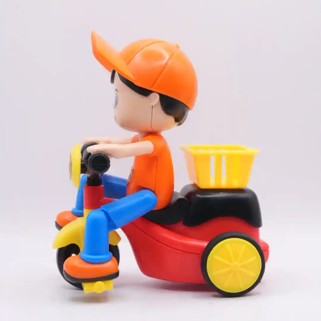 - Muñeco Articulado y Detallado: El muñeco presenta facciones amigables y ojos grandes y expresivos que invitan al juego. Sus brazos y piernas están posicionados como si estuviera pedaleando, creando una ilusión de movimiento y realismo.