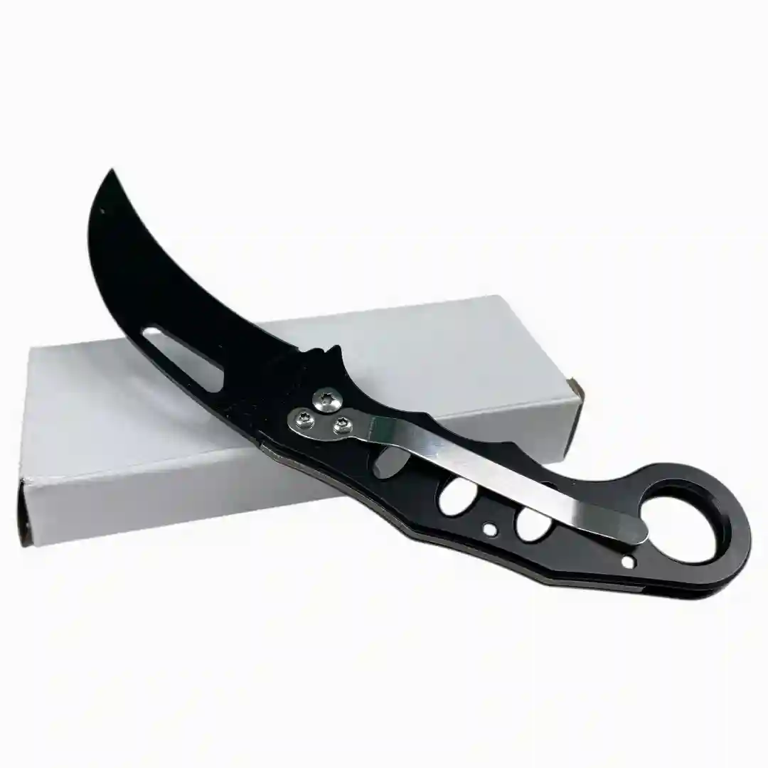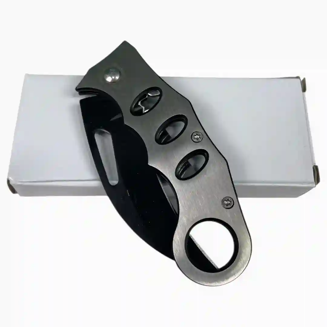 Características Hoja de acero con recubrimiento en color negro de alta resistencia. Apertura manual facilitada por un orificio ergonómico en la hoja. Empuñadura metálica con acabado plateado cepillado. Diseño con perforaciones funcionales para un agarre más seguro. Sistema de plegado fluido con tornillería de seguridad. Perfil aerodinámico que facilita su almacenamiento y transporte.