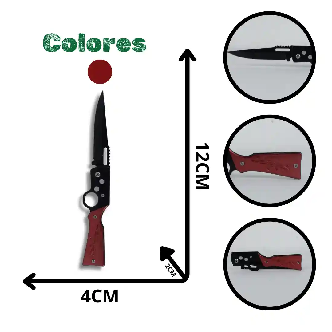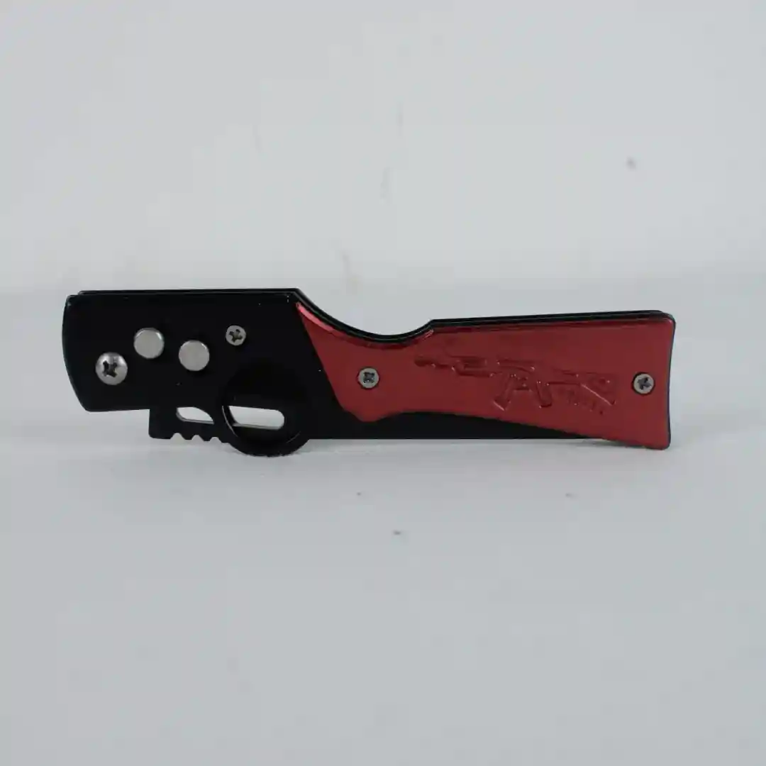 Temática Militar: Diseño de grabado de rifle AK-47 en el panel rojo del mango, muy atractivo para el nicho táctico.