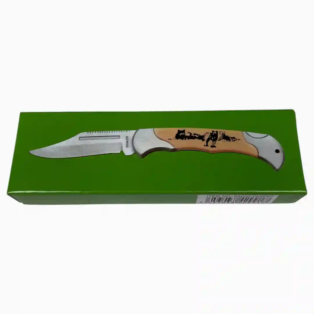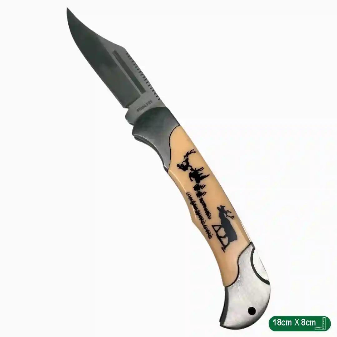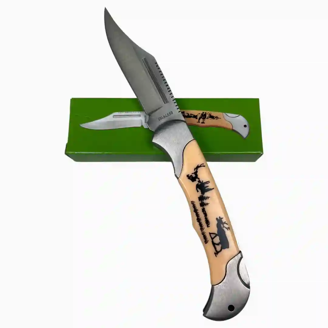 Navaja plegable de bolsillo con un diseño artístico y contemporáneo, caracterizada por su acabado integral en color negro mate. El mango presenta un grabado detallado con figuras de aves y motivos florales en contraste blanco, ofreciendo una estética elegante y distintiva. Es una herramienta compacta, diseñada para combinar un estilo visual atractivo con una funcionalidad práctica para el uso diario.
