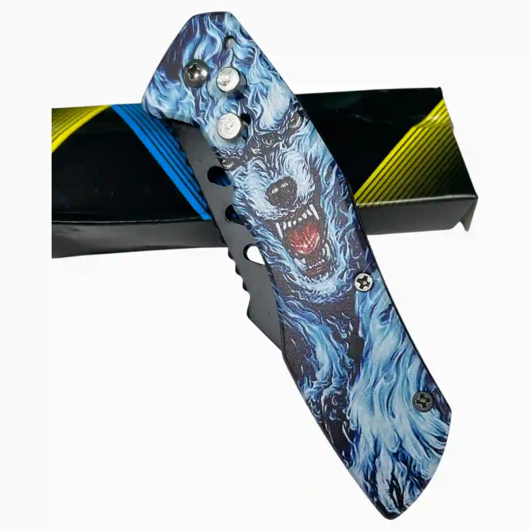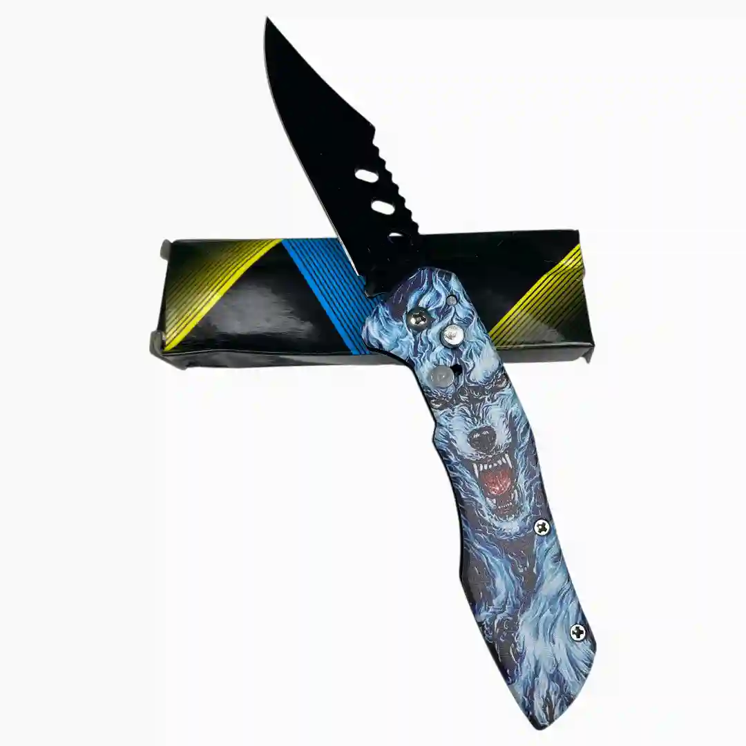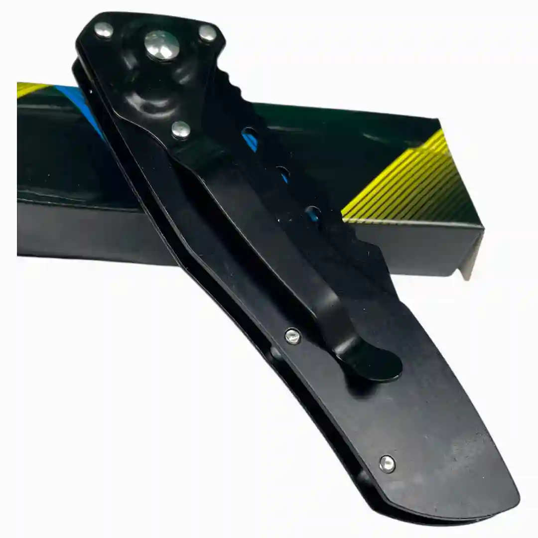 Navaja plegable de bolsillo con un diseño táctico y estilizado en acabado negro integral. Este modelo destaca por su ligereza y perfil delgado, ideal para el transporte diario. Su estructura combina una hoja de punta caída con un mango metálico decorado con patrones de perforaciones circulares que reducen el peso y mejoran la estética, convirtiéndola en una herramienta discreta y altamente funcional.