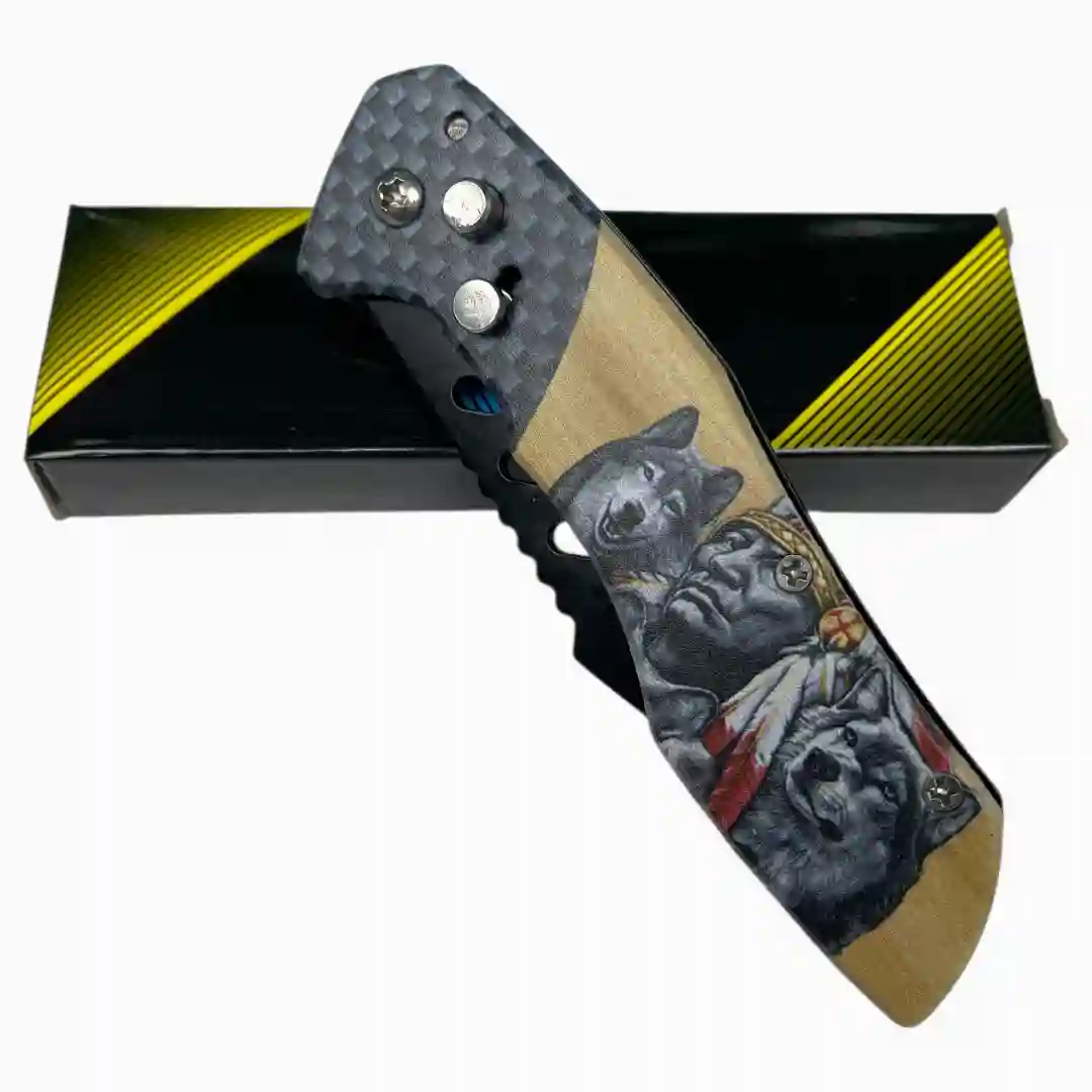 Navaja plegable de bolsillo con un diseño táctico minimalista en acabado negro mate integral. Este modelo destaca por su estructura ligera y perfil ultra delgado, facilitando un transporte discreto y cómodo. Su mango metálico cuenta con un patrón de perforaciones circulares que no solo aportan una estética moderna, sino que también optimizan el equilibrio y reducen el peso total de la herramienta.