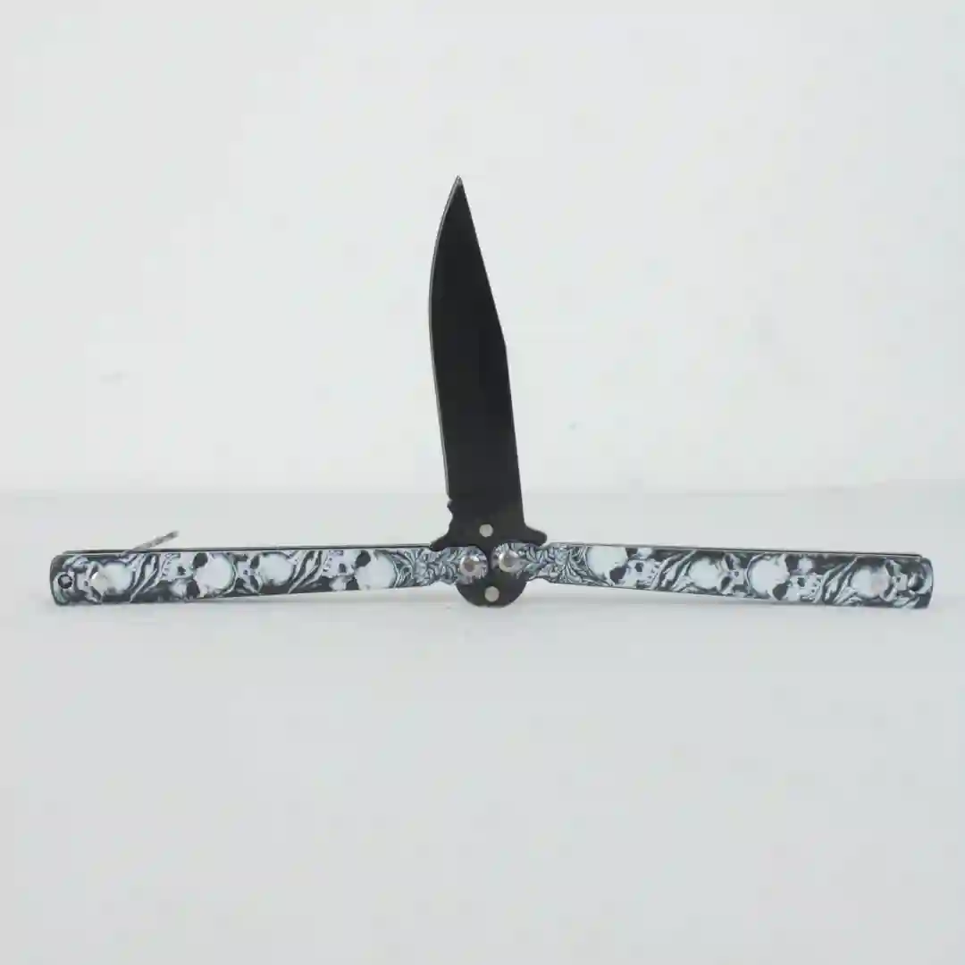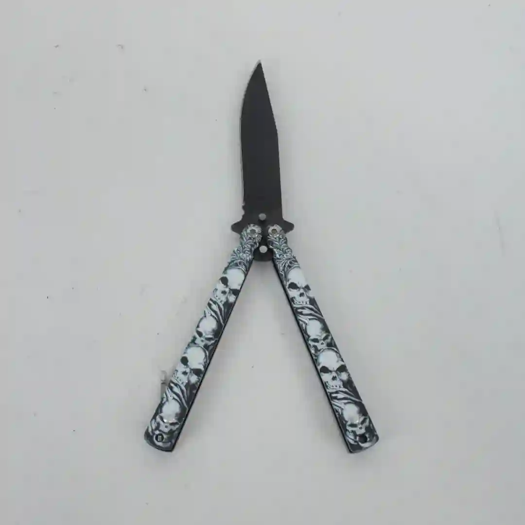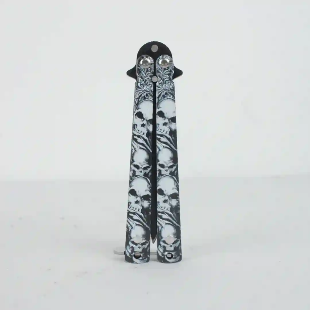 Navaja tipo mariposa (Balisong) diseñada para entrenamiento y colección, destacando por su estética agresiva y funcional. El mango presenta un diseño detallado de calaveras grabadas en relieve que proporcionan una textura táctica y un agarre superior. Su estructura equilibrada permite realizar movimientos y maniobras con fluidez, siendo una pieza robusta y duradera para entusiastas del equipo táctico.