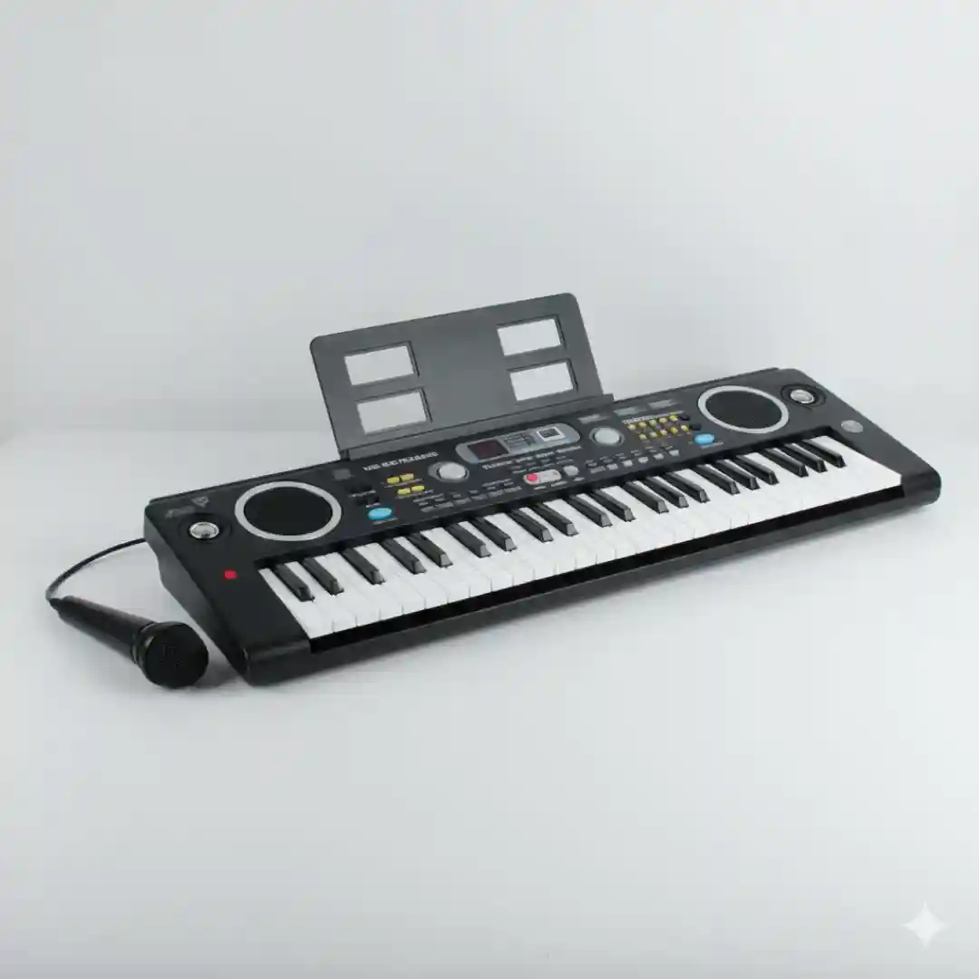 Teclado electrónico portátil de 49 teclas diseñado para el entretenimiento musical y la iniciación al aprendizaje. Este modelo se distingue por su enfoque multimedia, incorporando funciones de MP3 Player, FM Radio y puerto USB/TF Card, lo que permite reproducir música de fondo o pistas de acompañamiento directamente desde una fuente externa.