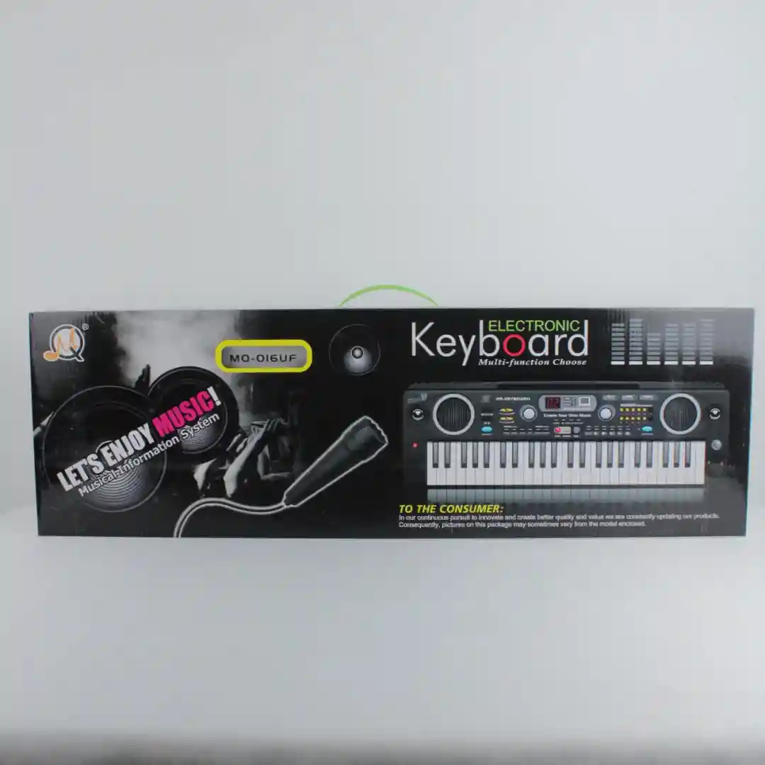 Contenido del Paquete: 1 Teclado Electrónico MQ-016UF de 49 teclas, 1 Micrófono con cable (para karaoke), 1 Atril para partituras (desmontable o integrado).