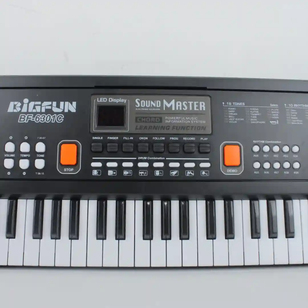 Observando el teclado, podemos ver que tiene una extensión ideal para principiantes: cuenta con 37 teclas, lo que proporciona el rango suficiente para practicar melodías, escalas y acordes básicos sin abrumar al niño. Las teclas blancas y negras mantienen el diseño tradicional del piano, facilitando la transición si deciden tomar lecciones formales más adelante.