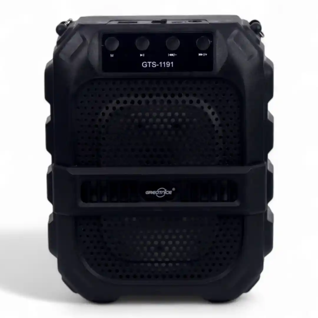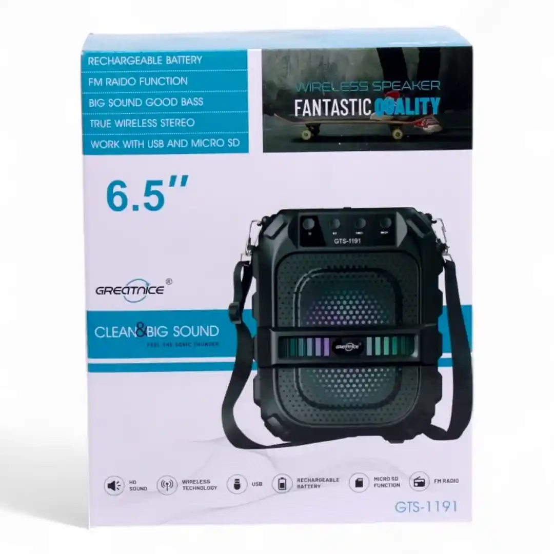 Lleva tu música a todas partes con el Parlante Portátil Greatnice GTS-1191, un dispositivo diseñado para los amantes del buen sonido y la máxima portabilidad. Con su potente rendimiento y su cómoda correa de transporte, este altavoz inalámbrico es tu compañero ideal para cualquier aventura, fiesta o simplemente para disfrutar de un sonido «CLEAN & BIG SOUND» donde quieras.