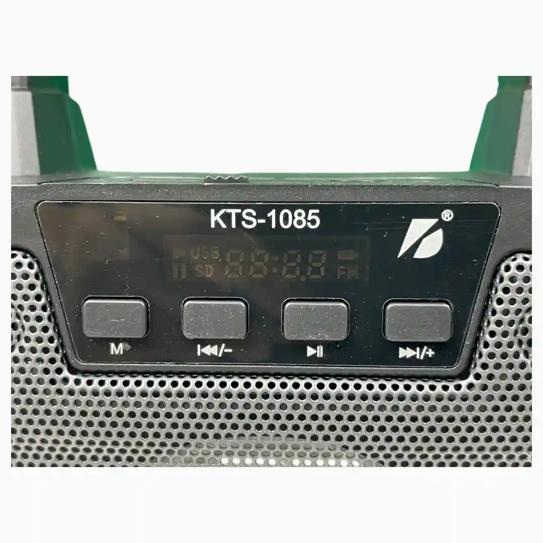 Especificaciones Marca: KBroad Referencia: KTS-1085 Tamaño del controlador de parlante: 4 pulgadas Puertos: USB, TF, DC 5V (Carga), MIC, AUX Botones de control: Modo (M), Retroceder/Volumen- (V-), Reproducir/Pausa, Adelantar/Volumen+ (V+) Funciones del control remoto: Encendido/Apagado, Modo, Silencio, Reproducir/Pausa, Pista anterior/siguiente, Volumen+/-, Ecualizador (EQ), Control de luces Alimentación: DC 5V vía micro USB