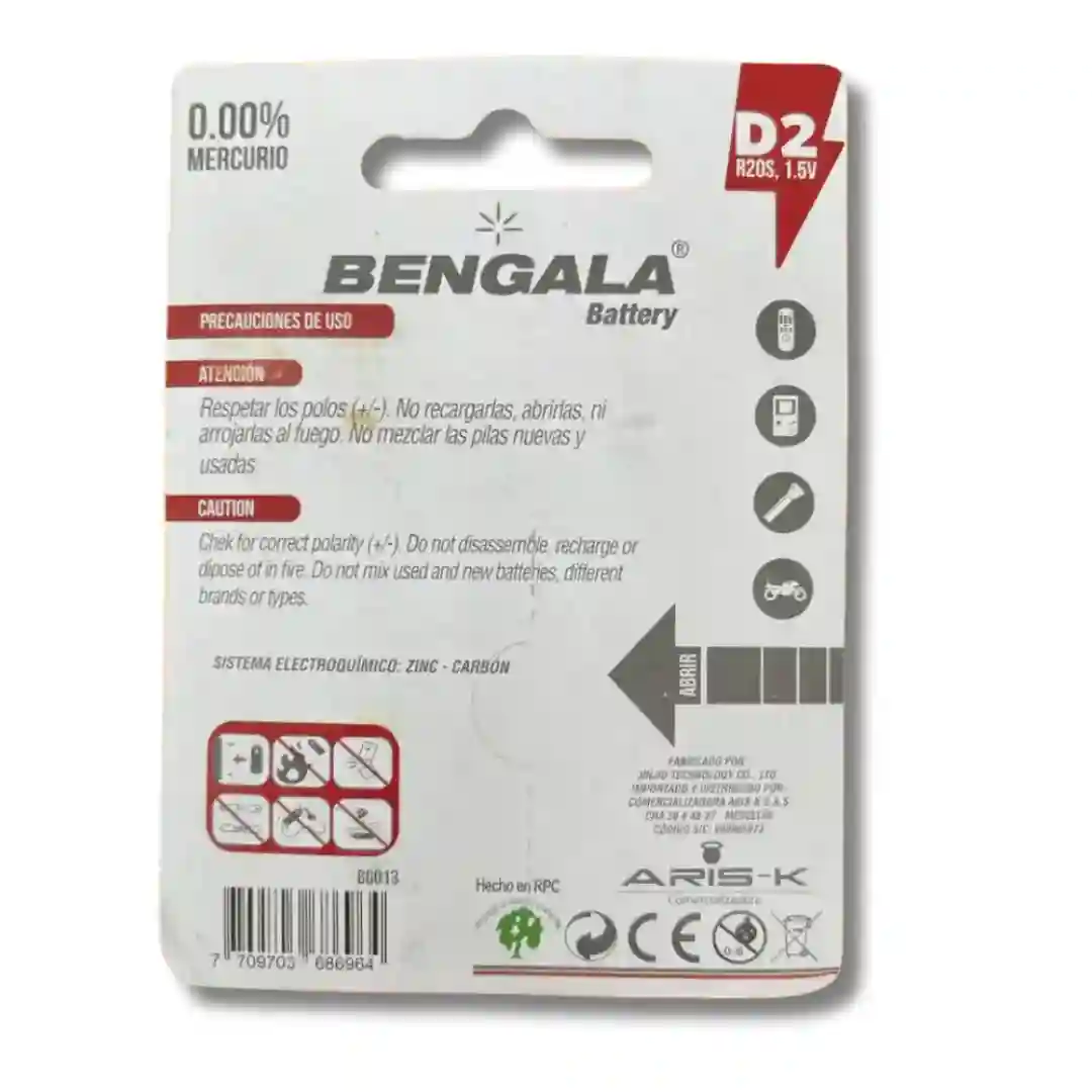 La pila de Zinc-Carbón Bengala D2 R20S 1.5V es la solución perfecta para alimentar tus dispositivos electrónicos de uso diario. Con su diseño confiable y rendimiento constante, esta pila te asegura la energía que necesitas para mantener tus aparatos funcionando sin problemas.