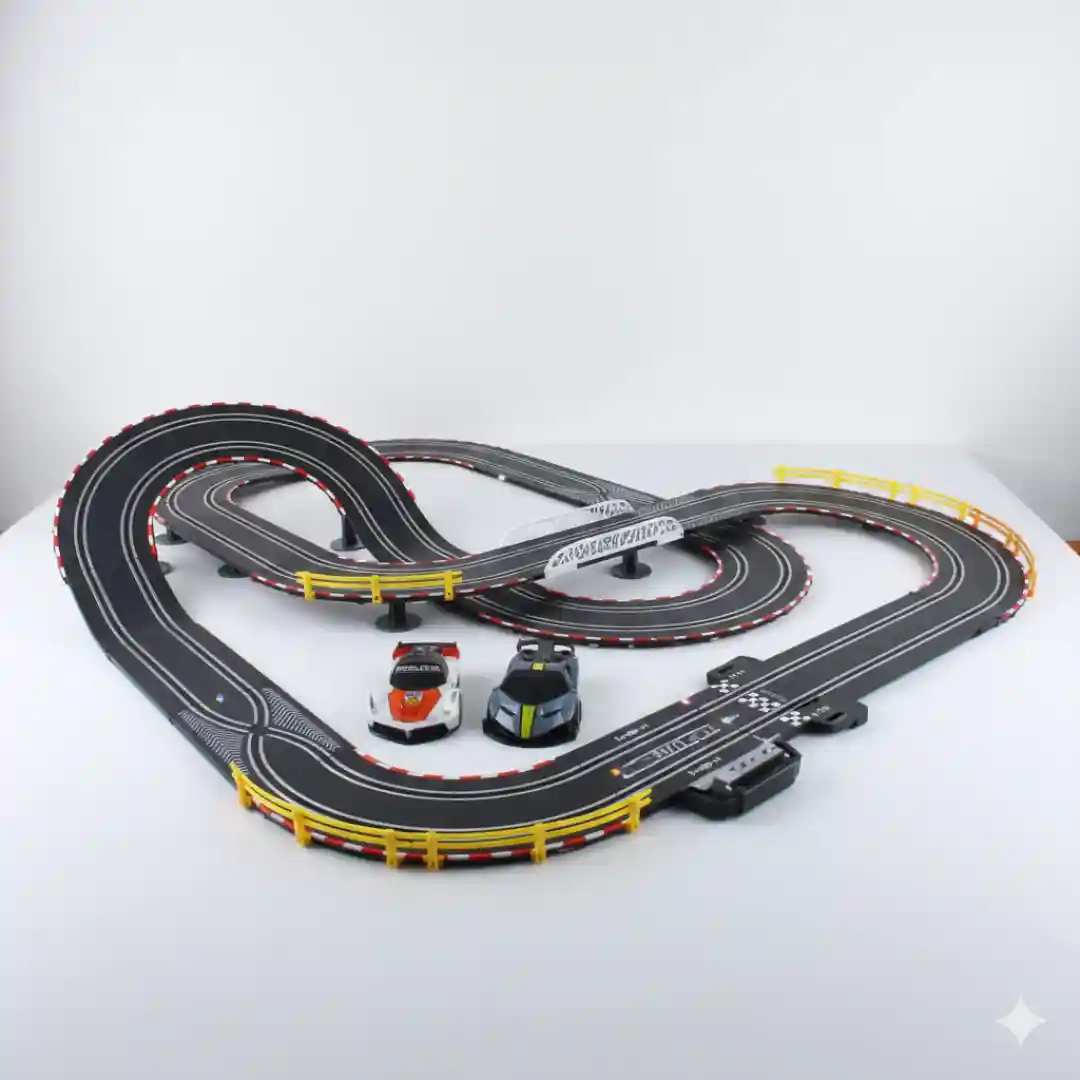 Presentación y empaque: Cada kit se presenta en una caja de cartón grande y de alta calidad, con un diseño que destaca las características clave del set y las diferentes configuraciones de la pista. El empaque robusto y atractivo es ideal para la exhibición en puntos de venta.