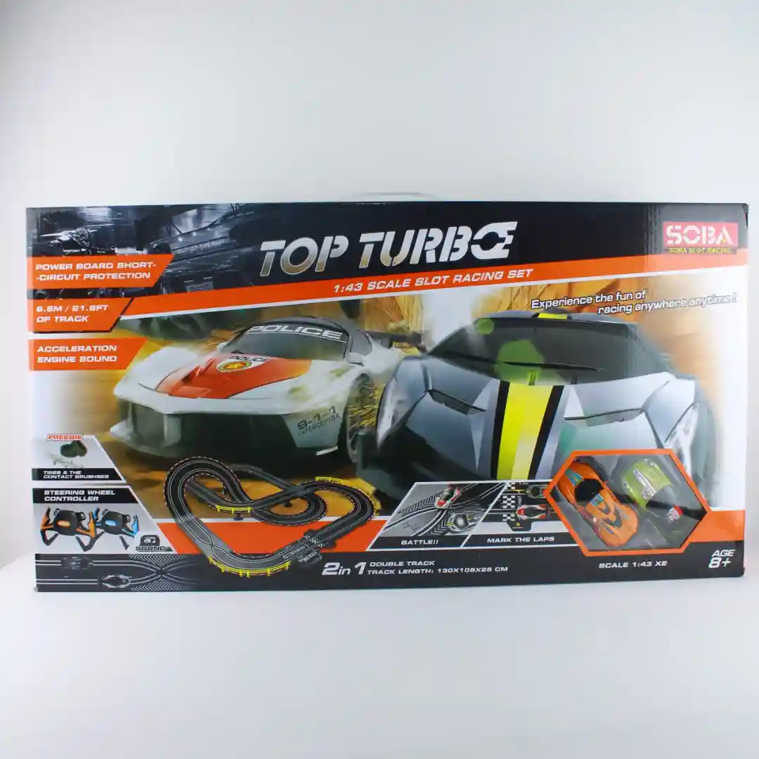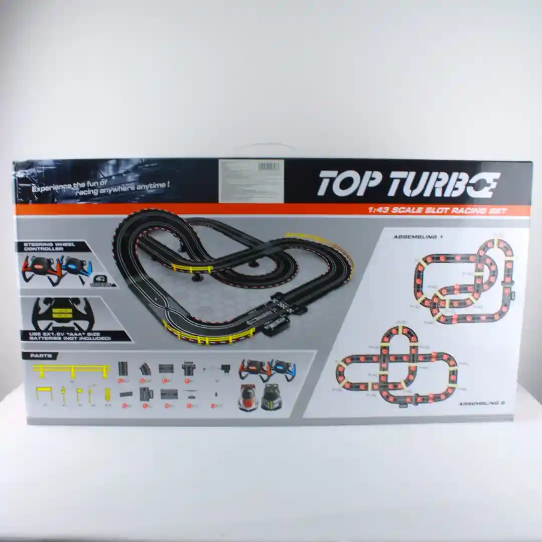 Ofrecemos la Pista de Carreras Eléctrica TOP TURBO, Referencia A47-22, un set de carreras de slot a escala 1:43 diseñado para una experiencia de juego emocionante. Este producto incluye una pista modular de doble carril de 6.6 metros de longitud total, que puede armarse en dos configuraciones diferentes. El set viene completo con dos vehículos de carreras y controles de volante, lo que lo convierte en un producto listo para usar y de gran atractivo visual. La referencia del producto es A47-22 y se presenta en cajas master de 8 unidades, optimizando la logística para la venta al por mayor.