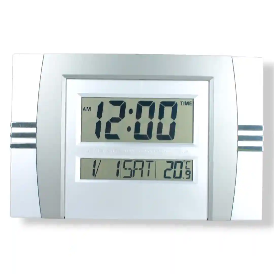 Reloj digital de gran tamaño con una pantalla LCD Jumbo de alta visibilidad, diseñado para ser versátil y funcional. Se puede usar tanto en la pared como sobre una superficie plana, ofreciendo información completa como la hora, fecha, día y temperatura.