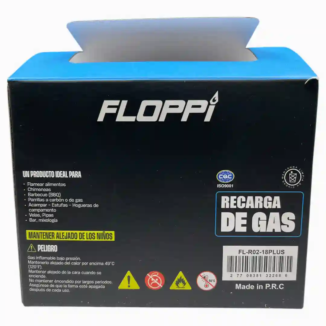 Especificaciones Marca: FLOPPI Contenido Neto: 18 mililitros por unidad Presentación: Caja por 400 unidades (Box x400) Tipo de Gas: Butano Instrucciones de seguridad: Aerosol extremadamente inflamable / Recipiente a presión