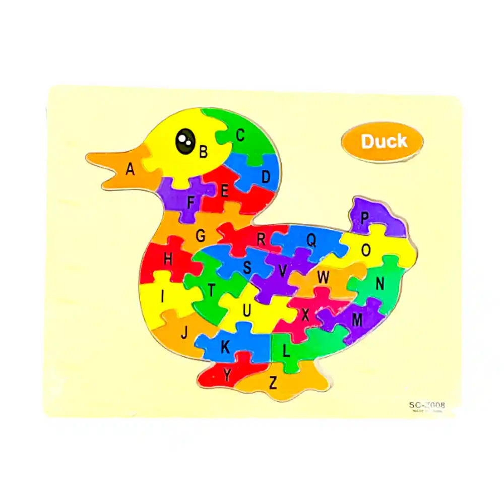 Cada pieza de este rompecabezas representa una letra del alfabeto, ¡desde la A hasta la Z! Pero eso no es todo, cada letra está ingeniosamente integrada en una figura encantadora. Un patito lleva la A, un gato la B, y así sucesivamente. ¡Aprender el abecedario nunca ha sido tan divertido!