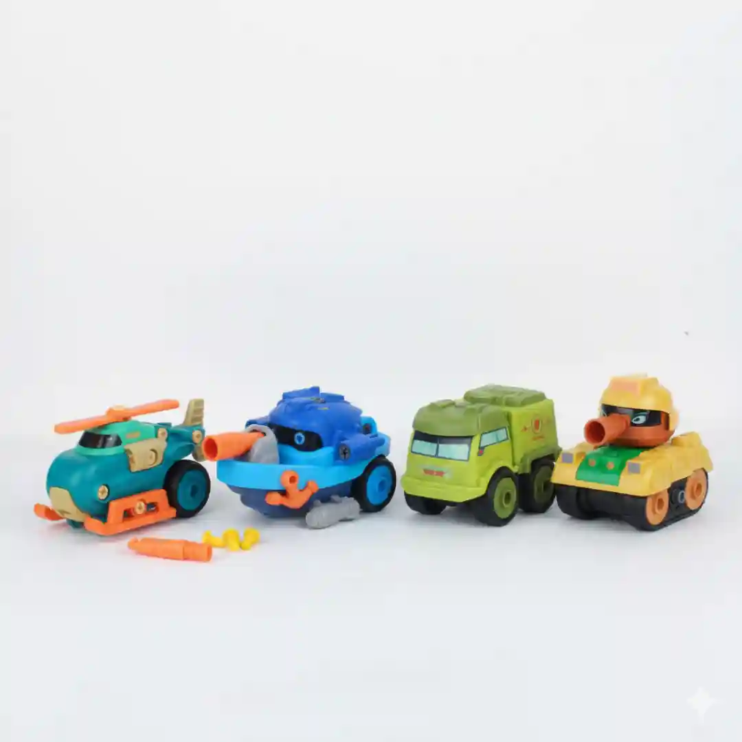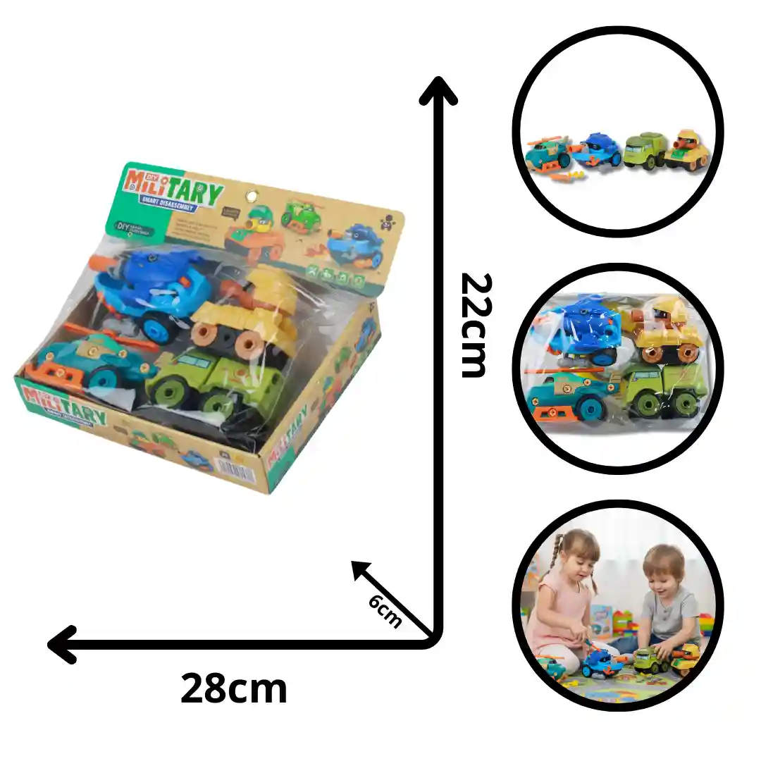4 vehículos de juguete desarmables (helicóptero, tanque, camión y vehículo de asalto)