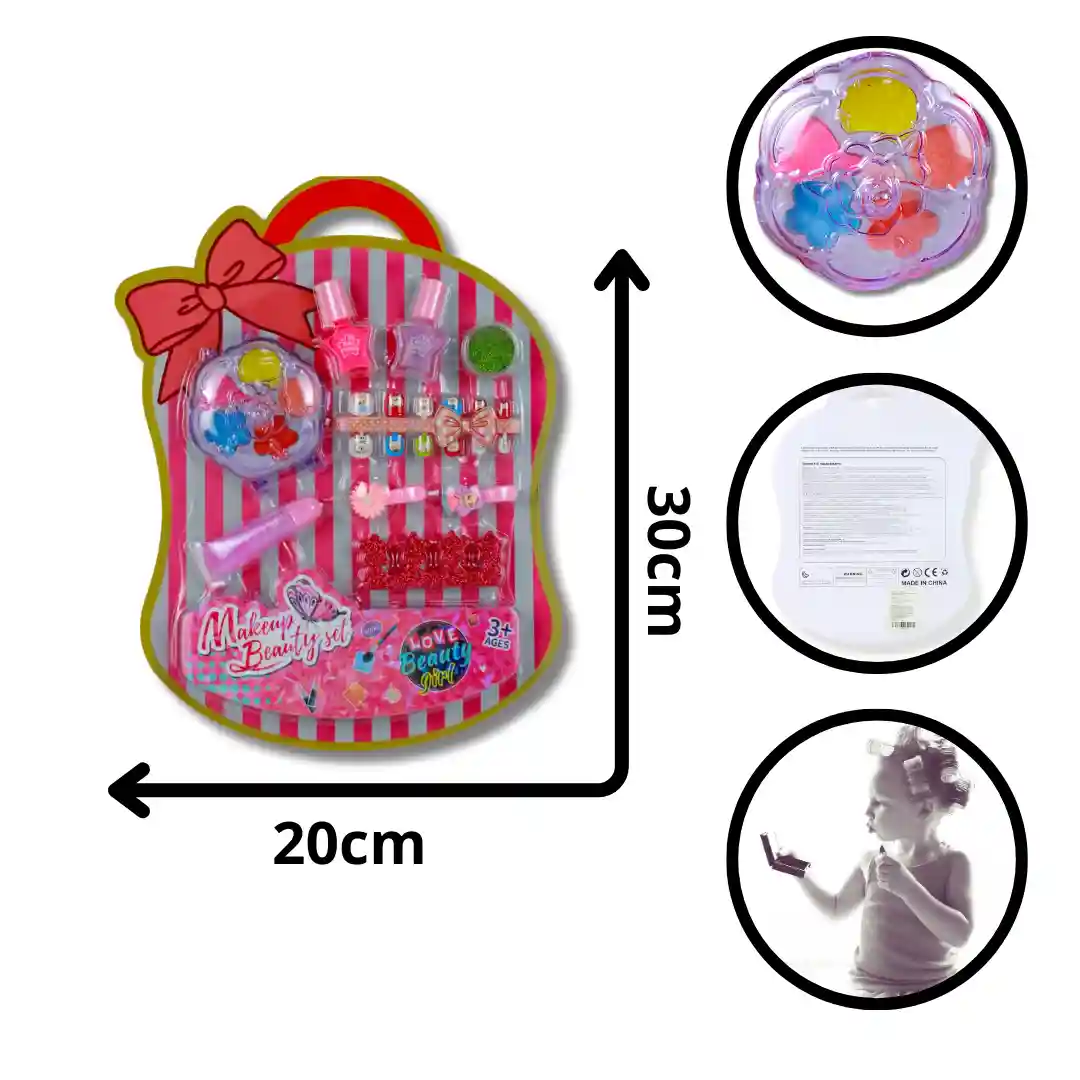 Componentes: Paleta de sombras con aplicador, brillo de labios, esmaltes de uñas, brillo en polvo y accesorios para el cabello.