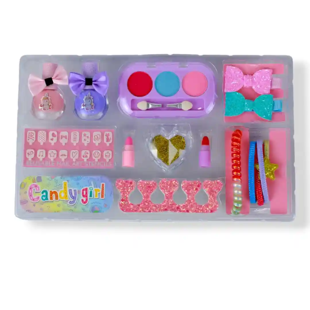 Componentes: Esmaltes de uñas, paleta de sombras, labiales, brillos, accesorios para el cabello y manicura.