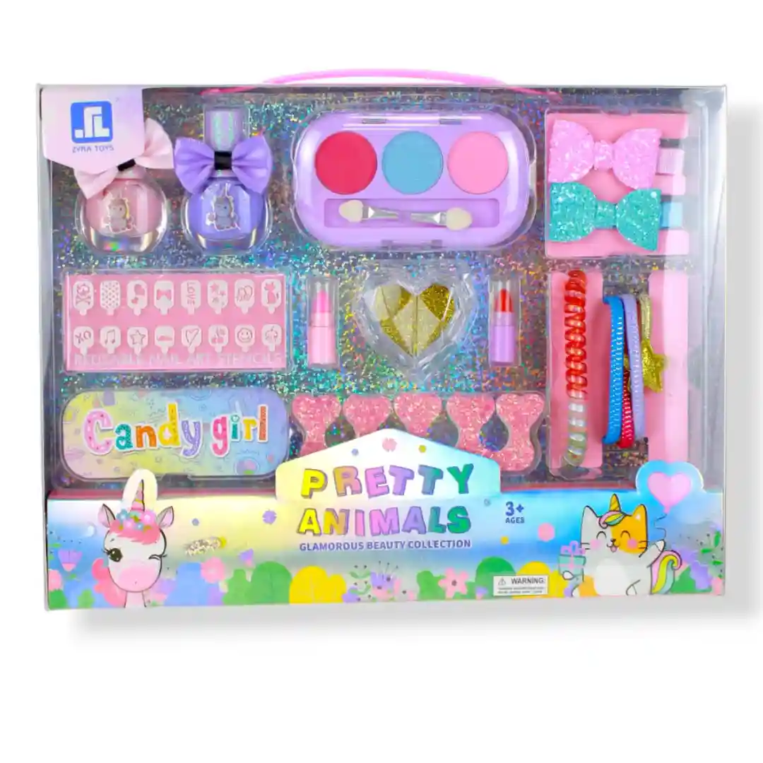 El «Pretty Animals Glamorous Beauty Collection» es un set completo de maquillaje y accesorios de fantasía para niñas. Su presentación en un maletín de cartón lo hace ideal para regalo, mientras que su temática de unicornios y colores pastel es irresistible para el mercado infantil. Este set es perfecto para el juego creativo, ofreciendo una variedad de productos para maquillaje y manicura de juguete.