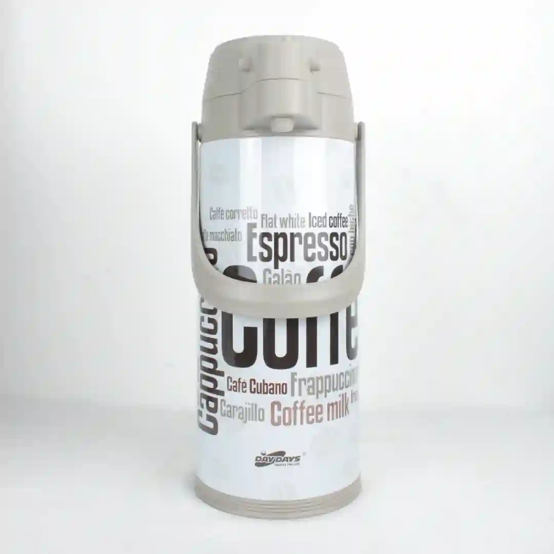 Termo de alta capacidad con diseño decorativo estampado, ideal para la conservación de temperatura de líquidos en entornos domésticos, de oficina o sociales. Este modelo cuenta con un sistema de aislamiento térmico de vidrio que garantiza una óptima retención del calor o frío por periodos prolongados. Su estructura exterior incluye un asa ergonómica fija para un vertido seguro y una tapa superior de rosca que asegura un sellado hermético, evitando derrames y manteniendo la higiene de las bebidas.