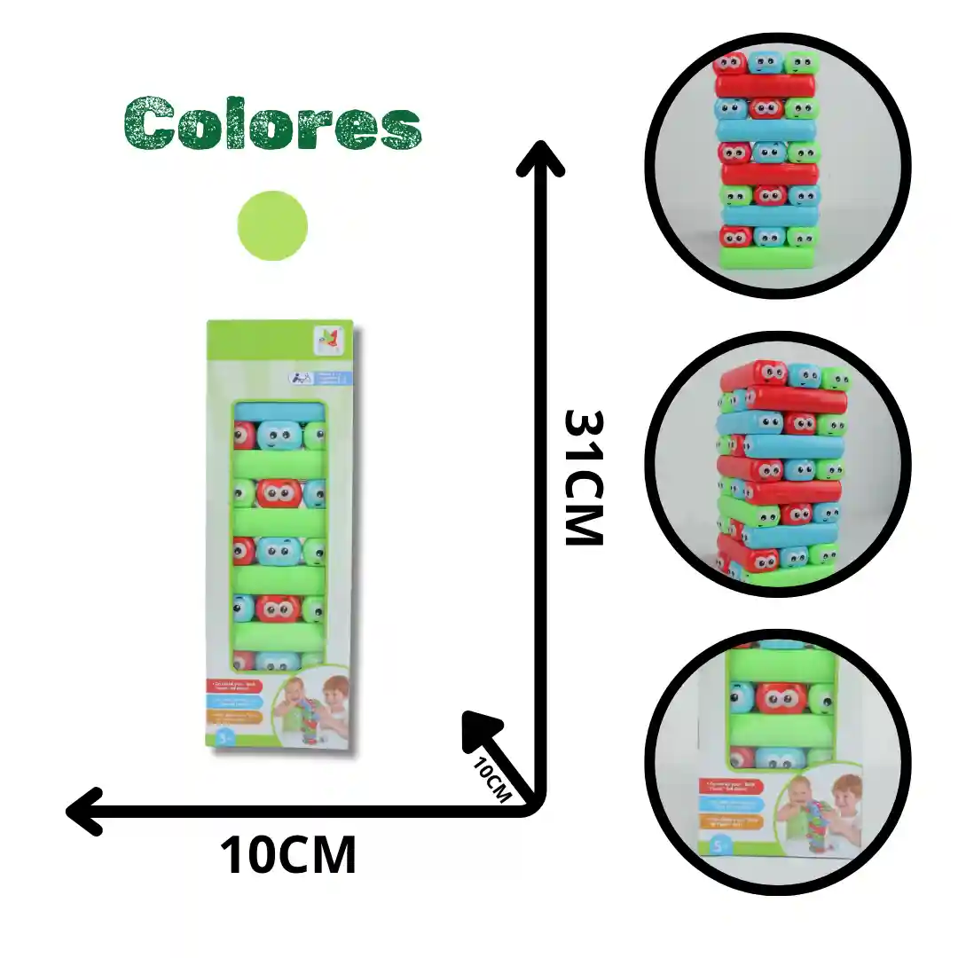 Presentación: Empaque de caja de cartón vertical, con gráficos vibrantes que muestran la torre de gusanos construida y los personajes temáticos. El empaque está diseñado para destacar la acción y la estabilidad del producto.