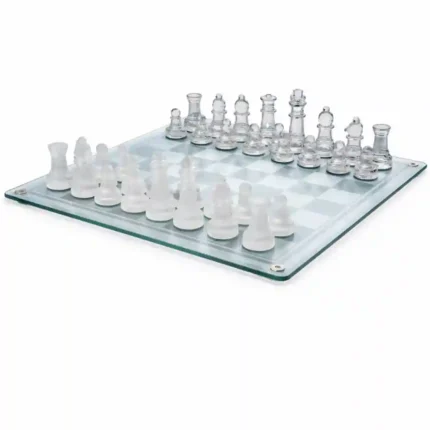 Elegante juego de ajedrez fabricado íntegramente en vidrio de alta calidad, diseñado tanto para el juego estratégico como para funcionar como una pieza de decoración sofisticada. El conjunto presenta un contraste visual único entre piezas de acabado transparente y piezas de acabado esmerilado, las cuales se deslizan sobre un tablero de vidrio grabado que alterna cuadros claros y opacos. Características Tablero de vidrio con diseño contemporáneo. Set completo de 32 piezas de ajedrez. Acabados contrastantes en vidrio transparente y vidrio esmerilado. Soportes antideslizantes en la base del tablero para mayor estabilidad y protección de superficies. Estética refinada ideal para oficinas, salas de estar o coleccionistas. Empaque con protección interna para el resguardo de cada pieza.