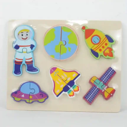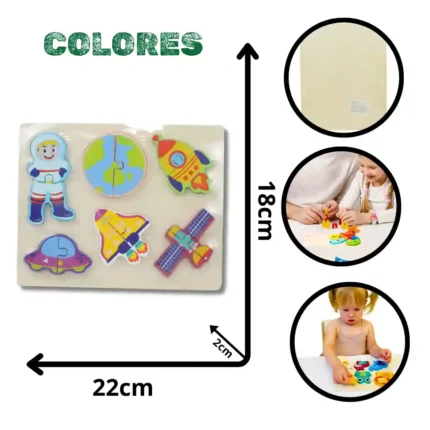 Rompecabezas didáctico fabricado en madera de alta calidad con temática espacial. Este juguete está diseñado para la estimulación temprana, permitiendo a los niños desarrollar habilidades de resolución de problemas y coordinación motriz fina. Las piezas presentan un diseño colorido de un astronauta, facilitando el aprendizaje visual y el reconocimiento de formas mediante el sistema de encaje sobre tablero. Características Material de madera natural resistente y duradero. Piezas con acabados suaves y bordes redondeados para seguridad infantil. Ilustración colorida con temática de astronauta y espacio. Pintura no tóxica de larga duración. Fomenta la concentración y la destreza manual. Base de madera que sirve como guía para el posicionamiento de las piezas.