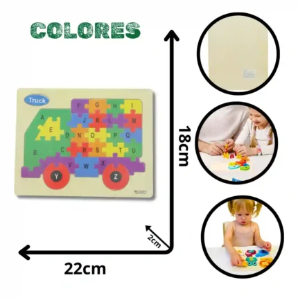Rompecabezas educativo de madera diseñado para facilitar el aprendizaje temprano del abecedario y la asociación de formas. Este tablero interactivo presenta letras mayúsculas con colores llamativos y un acabado suave, permitiendo que los niños desarrollen habilidades cognitivas y de lenguaje de manera lúdica. Es una herramienta pedagógica esencial para fortalecer la memoria visual y la coordinación motriz fina en las etapas iniciales de crecimiento. Características Fabricado en madera natural resistente y ligera. Pintura no tóxica con colores vibrantes para estimulación visual. Diseño de encaje de letras mayúsculas (ABC). Bordes redondeados para un manejo seguro y confortable. Superficie lisa que facilita la limpieza y el mantenimiento. Base de madera que sirve como guía estructural para el armado.