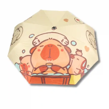 Sombrilla plegable de alta calidad con diseño exclusivo de Capybara. Este modelo destaca por su sistema de apertura y cierre automático, facilitando su uso con una sola mano. Cuenta con una estructura resistente y un revestimiento interno en color negro de alta densidad que proporciona una excelente protección contra los rayos solares y una impermeabilidad superior. Su diseño estético en tonos beige presenta ilustraciones detalladas de carpinchos en diversas actividades, combinando estilo y funcionalidad para los días de lluvia o sol.